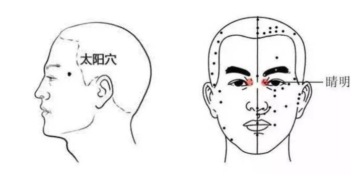 定位:太陽穴太陽穴的位置是在目外眥,就是外眼角和眉梢之間,向后約一橫指的凹陷中。睛明穴位于眼部內(nèi)側(cè),內(nèi)眼角稍上方凹陷處。
